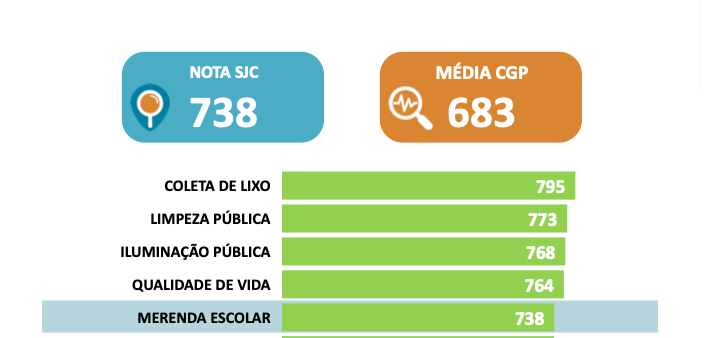 A Merenda Escolar de São José dos Campos registrou avanço na pontuação no levantamento mais recente das pesquisas da INDSAT. Registrando 738 pontos, o setor ficou acima da média das Cidades de Grande Porte, indicando mais uma vez pontuação superior nas pesquisas. O número classificou o serviço em Alto Grau de Satisfação, classificado em 5º lugar entre os 16 serviços avaliados na cidade.